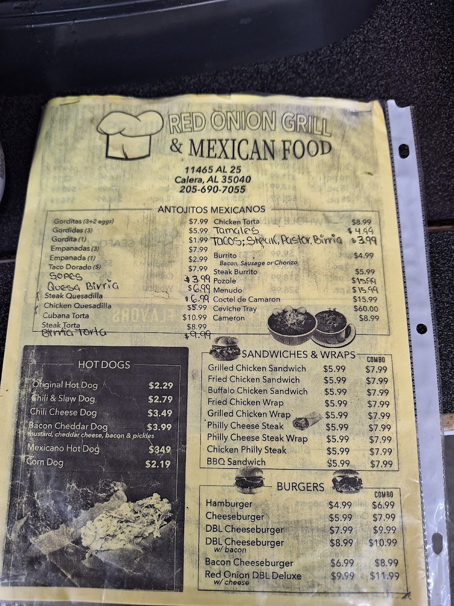 Welcome to Red Onion, nestled conveniently at 11475 AL-25 in Calera, Alabama. This hidden gem, located within a gas station, has quickly become a favorite pit stop for travelers and locals alike. Red Onion boasts a menu that surprises with its variety, featuring mouth-watering offerings such as quesadillas, chili dogs, and empanadas.